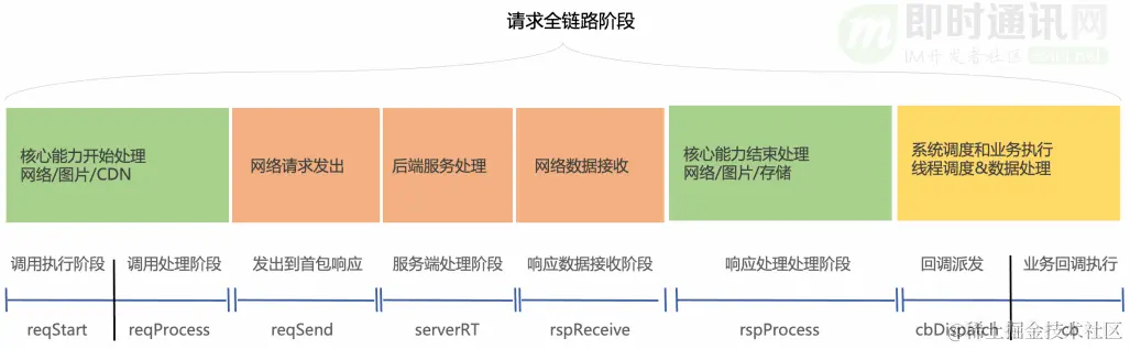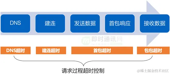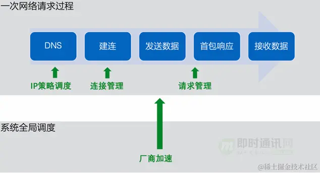 **一次完整的请求网络传输大致可以分为以下链路:**即DNS->建连->发送数据->等待首包响应->接收数据。过程中 IP 策略调度、连接管理、请求管理及厂商全局调度加速子模块各承担着不同的作用,笔者将逐一介绍阐述。