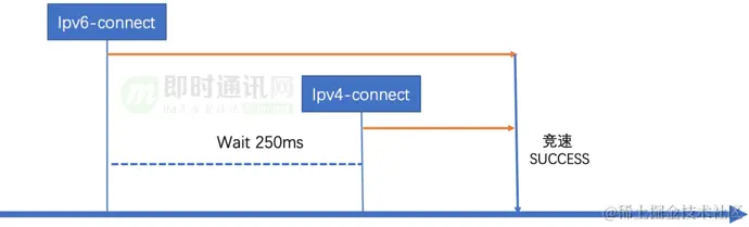 复合连接思路也因此来源于 IPv6 Happy Eyeballs 算法实现,详见RFC 6555。