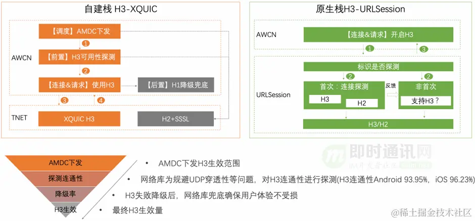- 2)鉴于非标的影响,请求链路上需要强依赖 AMDC,必须通过 AMDC 配置明确支持 h2+sssl 方式的域名下发后才能支持;