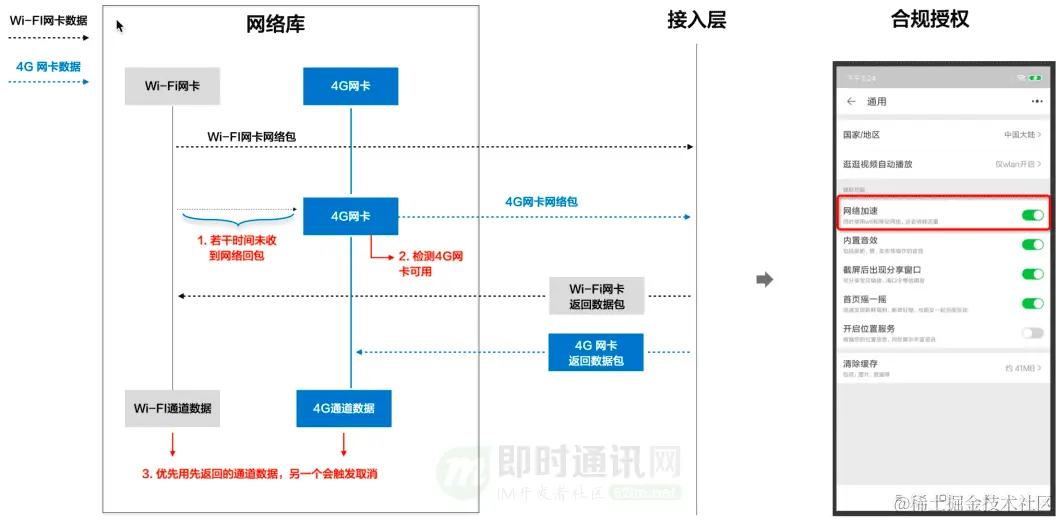 除了常规的技术应用,因为涉及到用户在 WIFI 网络下的流量损耗,我们遵从用户隐私等合规前提下,提供多通道能力生效的用户提示和功能授权。