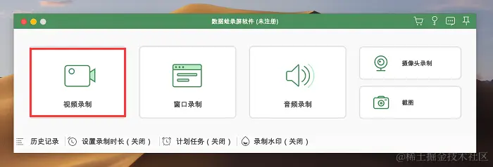 第1步:访问数据蛙录屏软件官网并下载合适的版本,安装完成后,双击图标打开软件,您可以看见一个简洁的页面,录制视频我们选择 “视频录制” 模式。