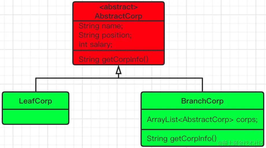那么在类的设计中,我们首先创建抽象的员工类AbstractCorp,在这个类中定义职员信息,比如:姓名,职位,薪水……,然后对于普通职员,我们创建基层员工类LeafCorp,对于管理者员工,我们创建BranchCrop类,这两个类的区别就是,管理者中要包含一个变量corps,用于存储他手下团队的所有员工。具体类图如下所示: