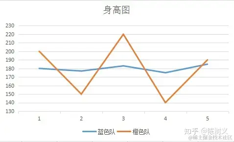 两支队伍平均身高都是 180,看起来似乎差不多。但如果画图的话,得到结果如下: