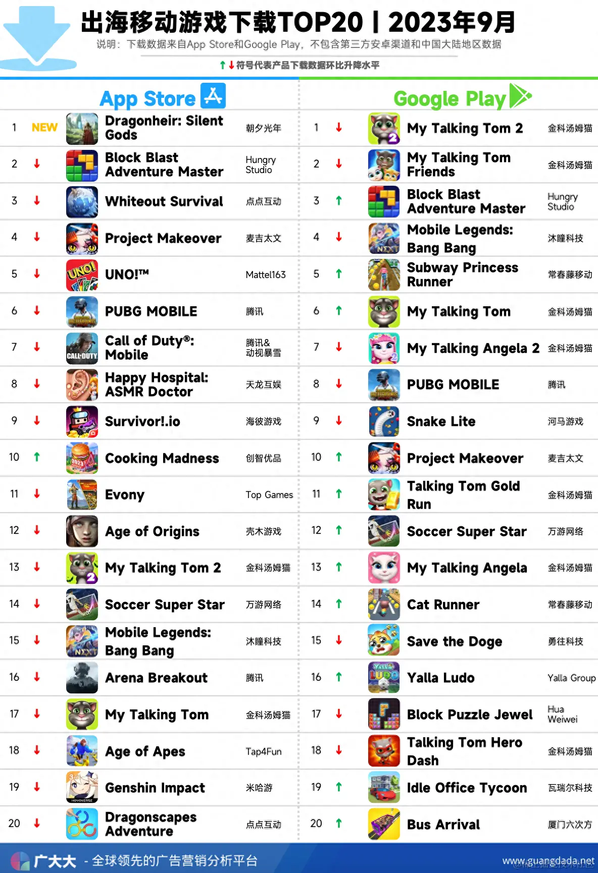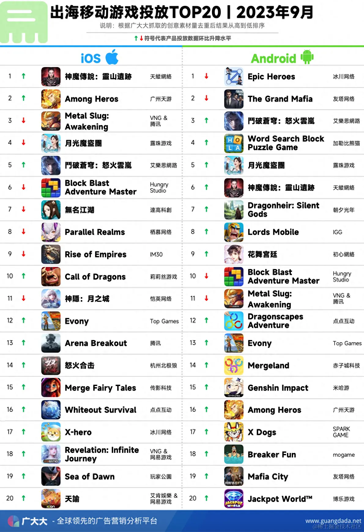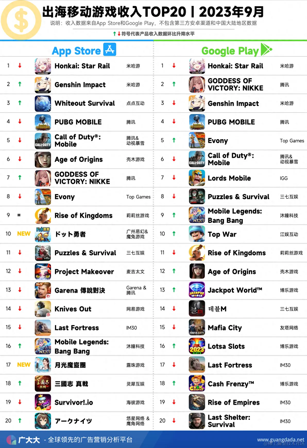 根据广大大——App Intelligence等模块数据,我们整理出2023年9月成功出海手游厂商投放、收入和下载TOP20榜单,帮助更多出海手游从业人员了解全球移动市场变化趋势。