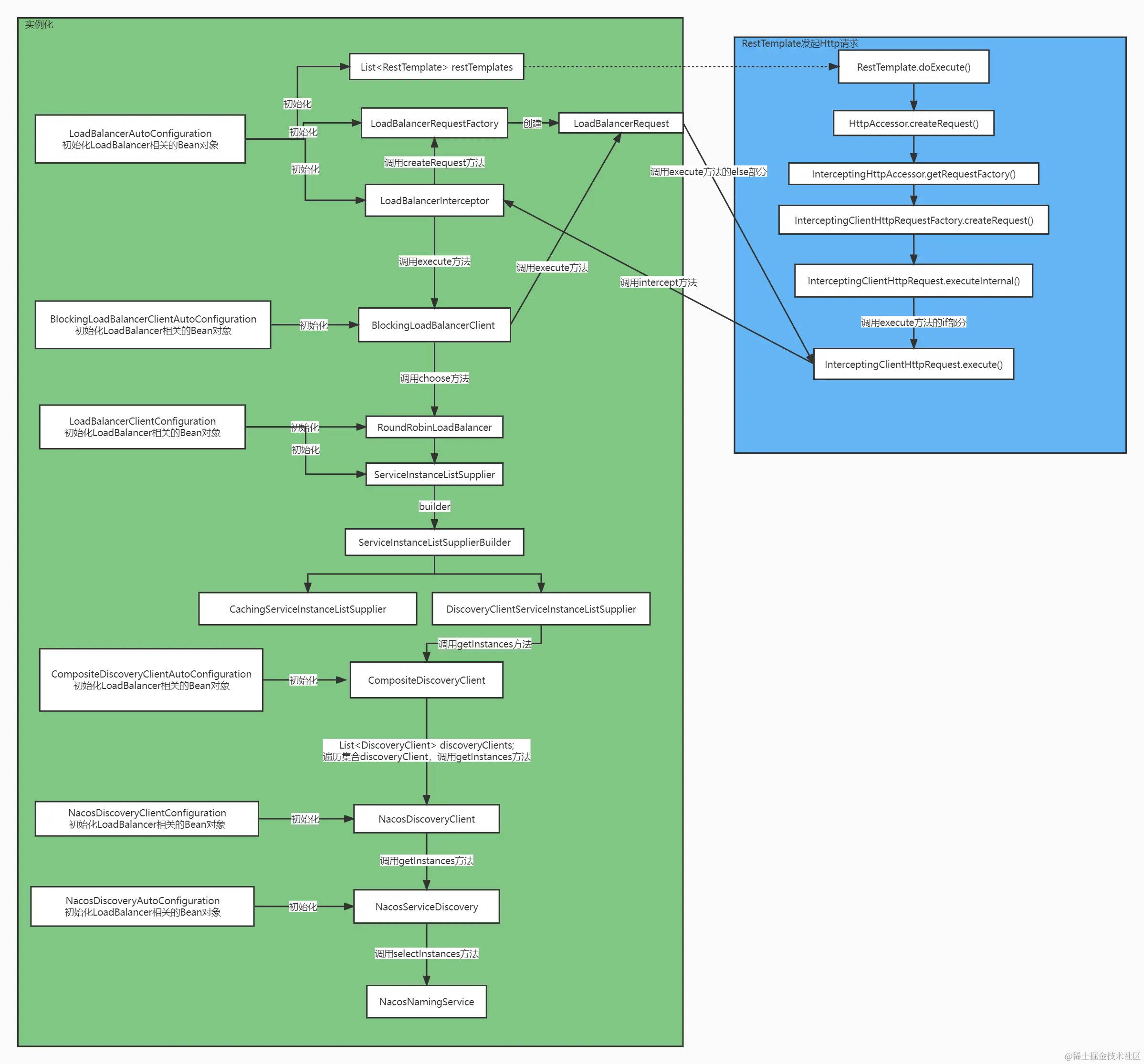 Loadbalancer 的DiscoveryClientServiceInstanceListSupplier (实现ServiceInstanceListSupplier接口)会调用NacosDiscoverClient 将服务列表缓存在serviceInstances中提供给负载均衡器使用