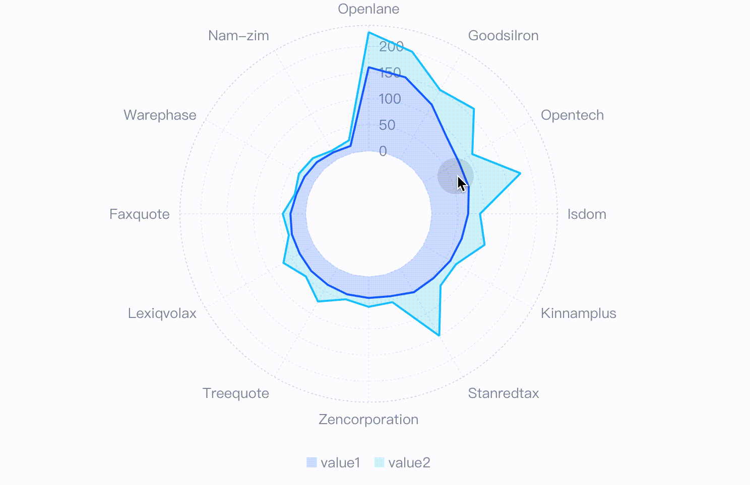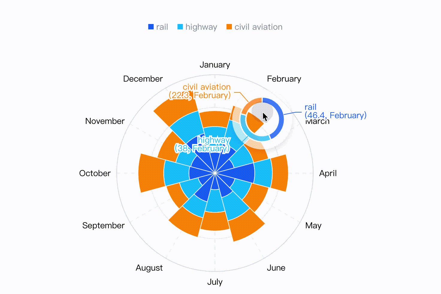 在VChart中,十字准星不止以“十字”的形式存在于笛卡尔坐标系,在极坐标系场景下也能以弧线、射线或扇形的形式准确指示鼠标所在位置。
