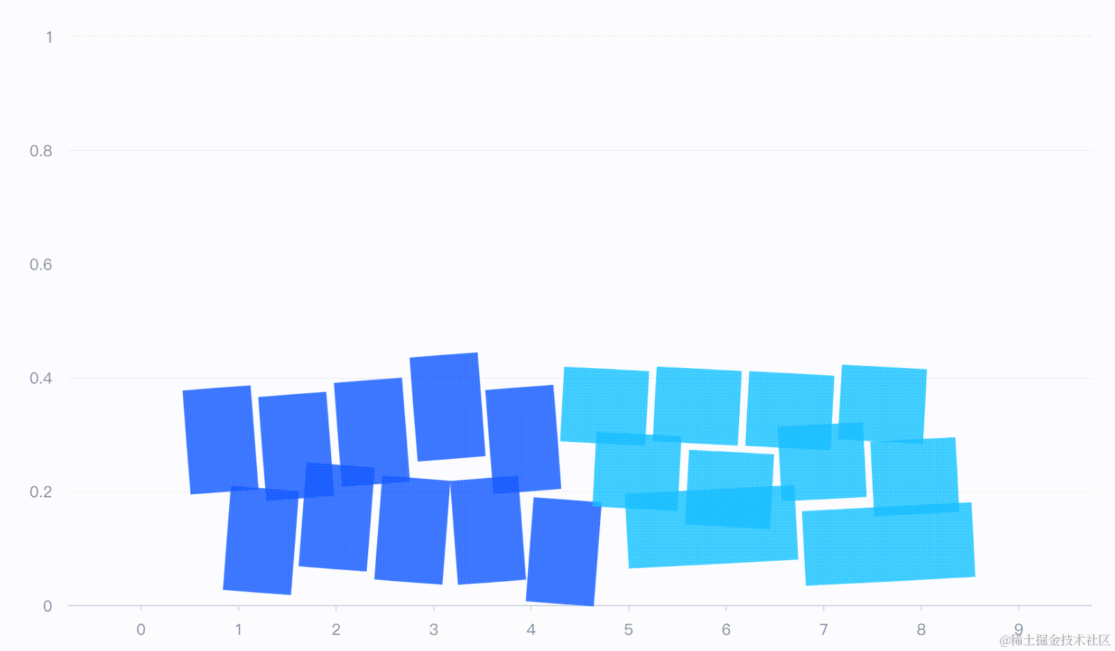 根据前文描述,入场、数据更新等都比较好理解,而何为系列配置更新动画?可以理解为图表由一种类型变换到另一种类型所需要的过渡动画,图表类型的变换势必会带来元素形状的变换,基于VGrammar动画语法的支持,图元能够丝滑地进行形变过渡。形变动画分为:一对一动画、一对多动画和多对一动画。