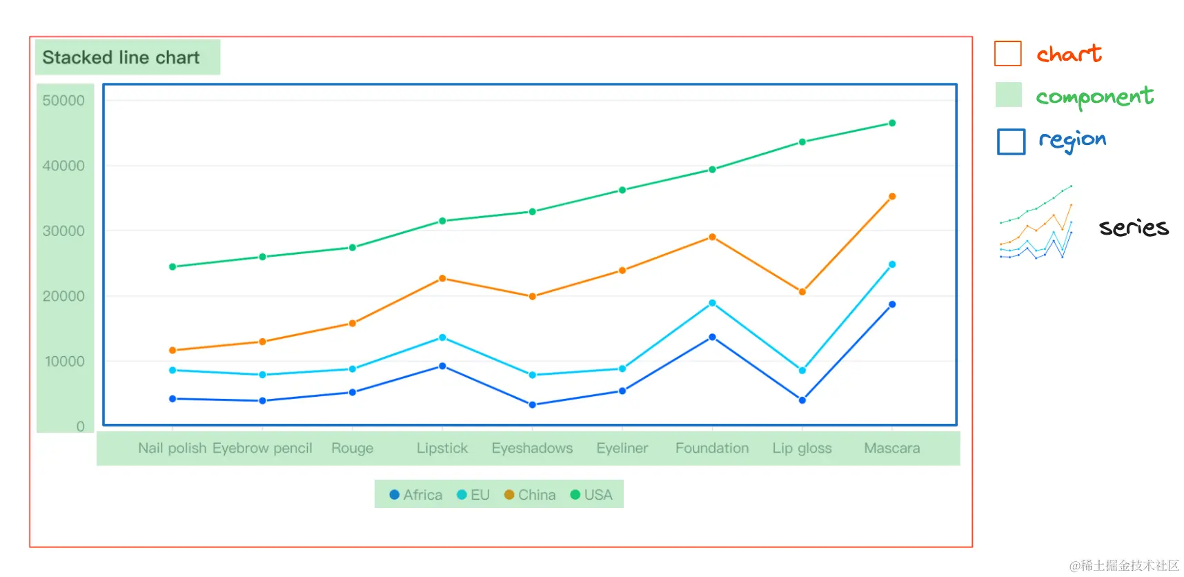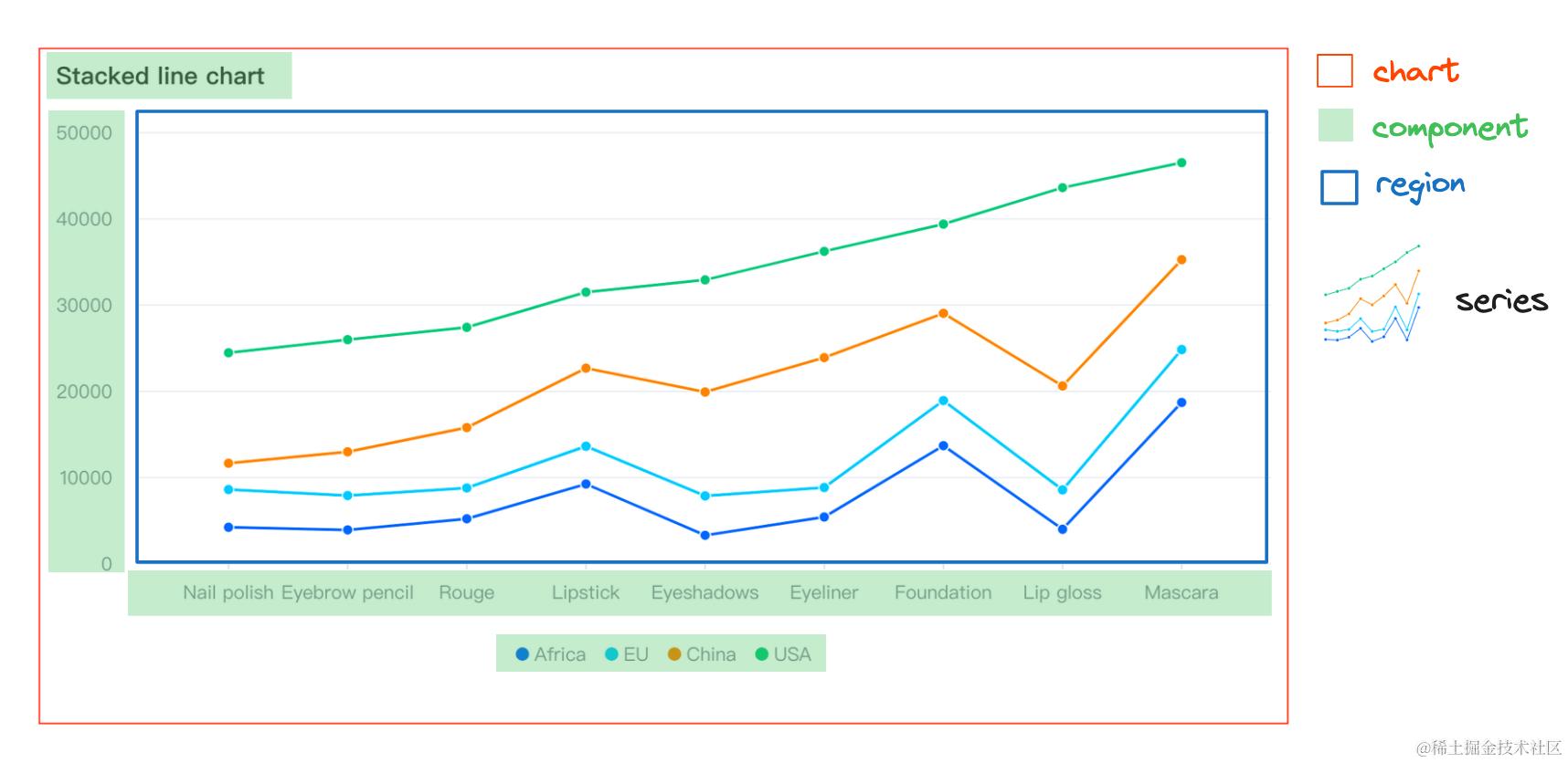 - 区域(region) 是一个空间信息元素,它可以关联一组或多组 series,帮助 series 进行空间定位,同时 region 还是一个最小组合单元。