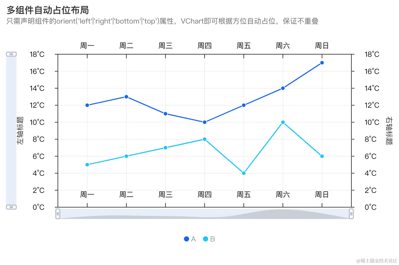 我们从不认为图表是一个独立的个体,它由可复用的各种组件、数据系列组装而成。每个组件、数据系列都有着自己的容器,如何对这些容器合理布局一度成为可视化开发者的思考着力点。为了满足不同布局需求,VChart支持三种布局模式,「占位布局」、「行列布局」和「自定义布局」。
