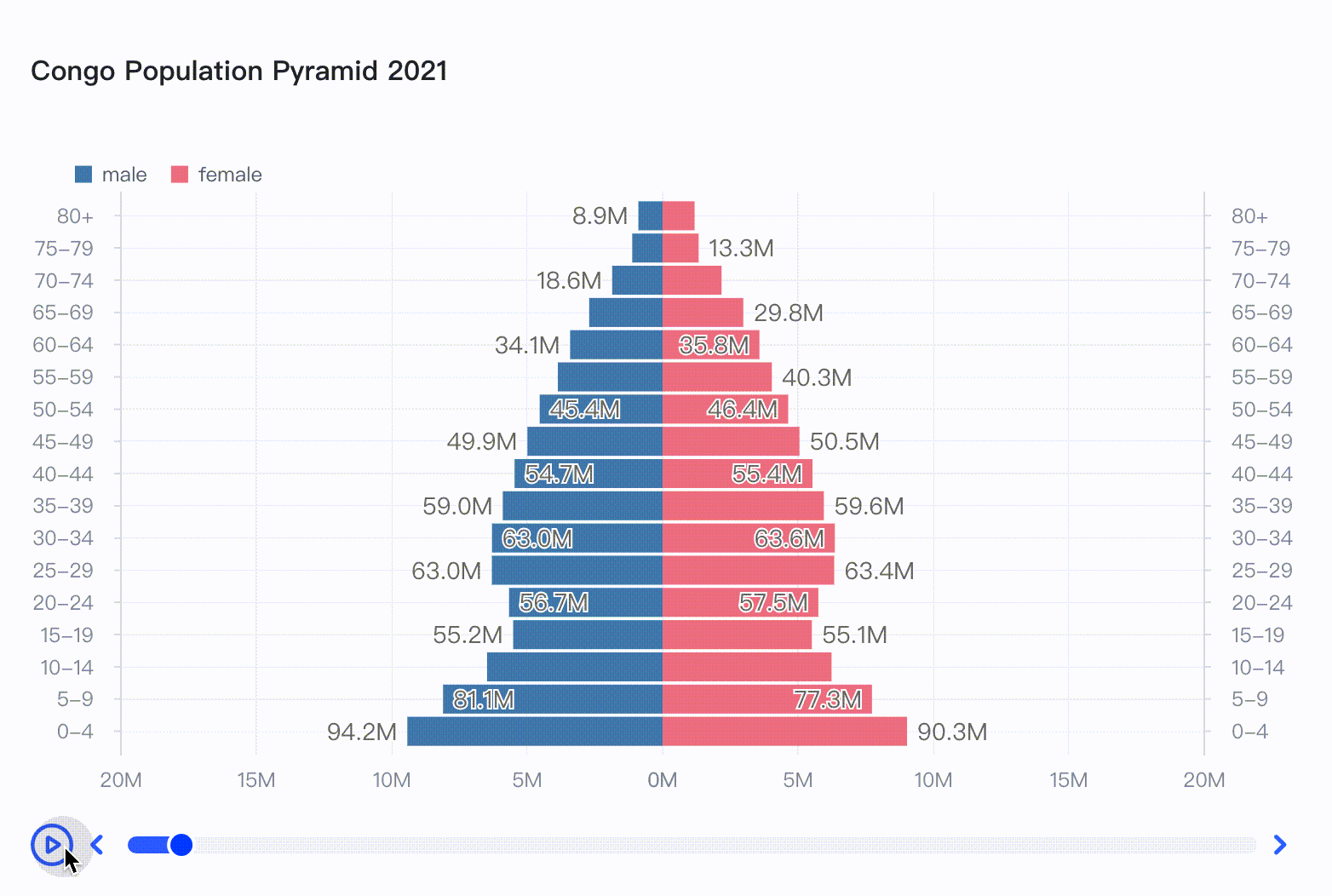 为了更好的编排和展示图表的不同状态,我们提供动画时长、动画延长开始时长、动画缓动效果和依次执行等配置,精准把握时间节点和播放速度。除此之外,我们支持多个并行动画时间线以及时间线内部的串行动画,不同图表类型间切换的过渡动画, 这些都大大提升了动画编排能力,支持更丰富的叙事场景。