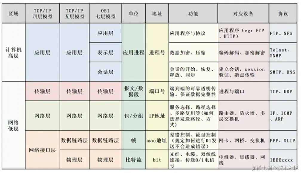 | 传输层 | 报文段 | 负责提供可靠的传输服务,对应OSI参考模型的第四层 | TCP(控制传输协议) UDP(用户数据报协议) |