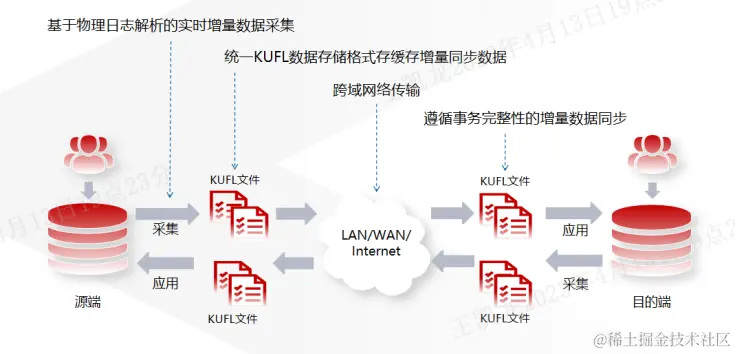 KFS的主要角色分为源端和目标端,其中源端连接源数据库,通过实时采集数据库的日志信息并解析处理,统一成以KUFL数据存储格式的物理文件。目标端通过网络连接到源端,不断获取由源端产生的KUFL文件,解析以后由目标端连接目标数据库,以遵循事务完整性的原则将数据写入到目标数据库中。而过滤器可配置在采集阶段或者应用阶段,以适用与不同的数据过滤场景。