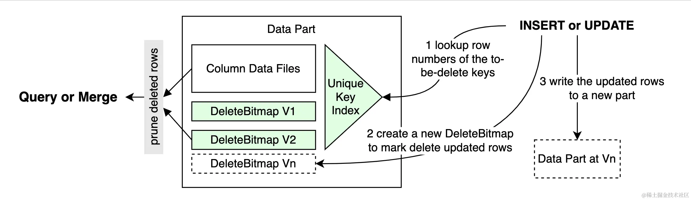 为了加速执行,ByConity 对 Unique Key 创建了 index。因为在 Bitmap 中放的是行号,从 key 到行号需要索引,通过 Unique Key Index 可以实现 Key 到行号的快速定位。