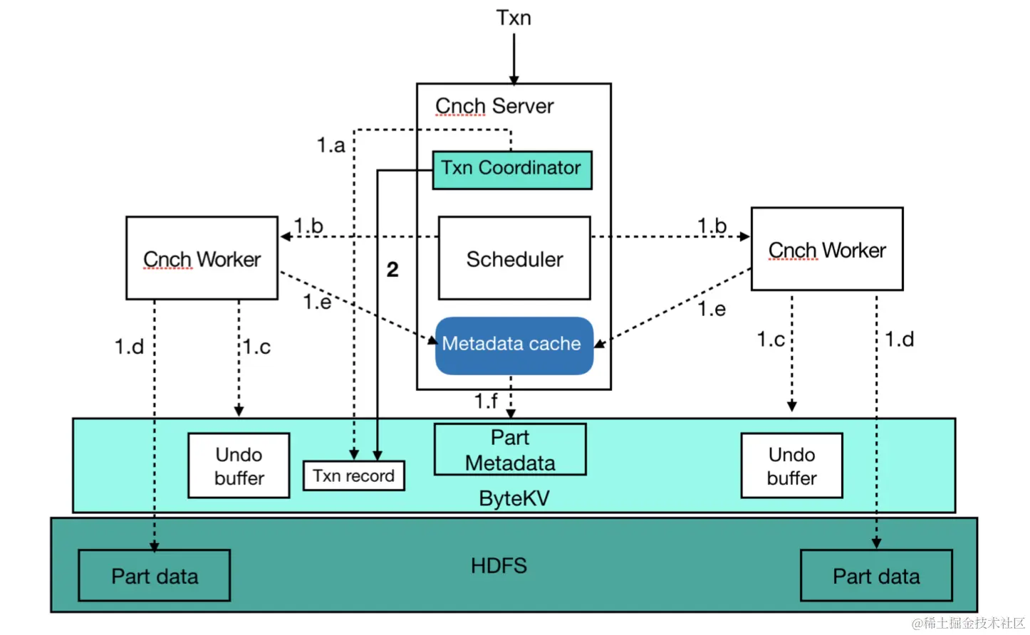 在事务的具体实现中,这是一个典型的两阶段提交的实现。第一个阶段写入事务记录,包括写 undo buffer,远端存储,提交元信息等。第二个阶段真正提交事务,并更新事务记录的提交时间。在事务成功和失败的时候,用 undo buffer 去做一些清理。
