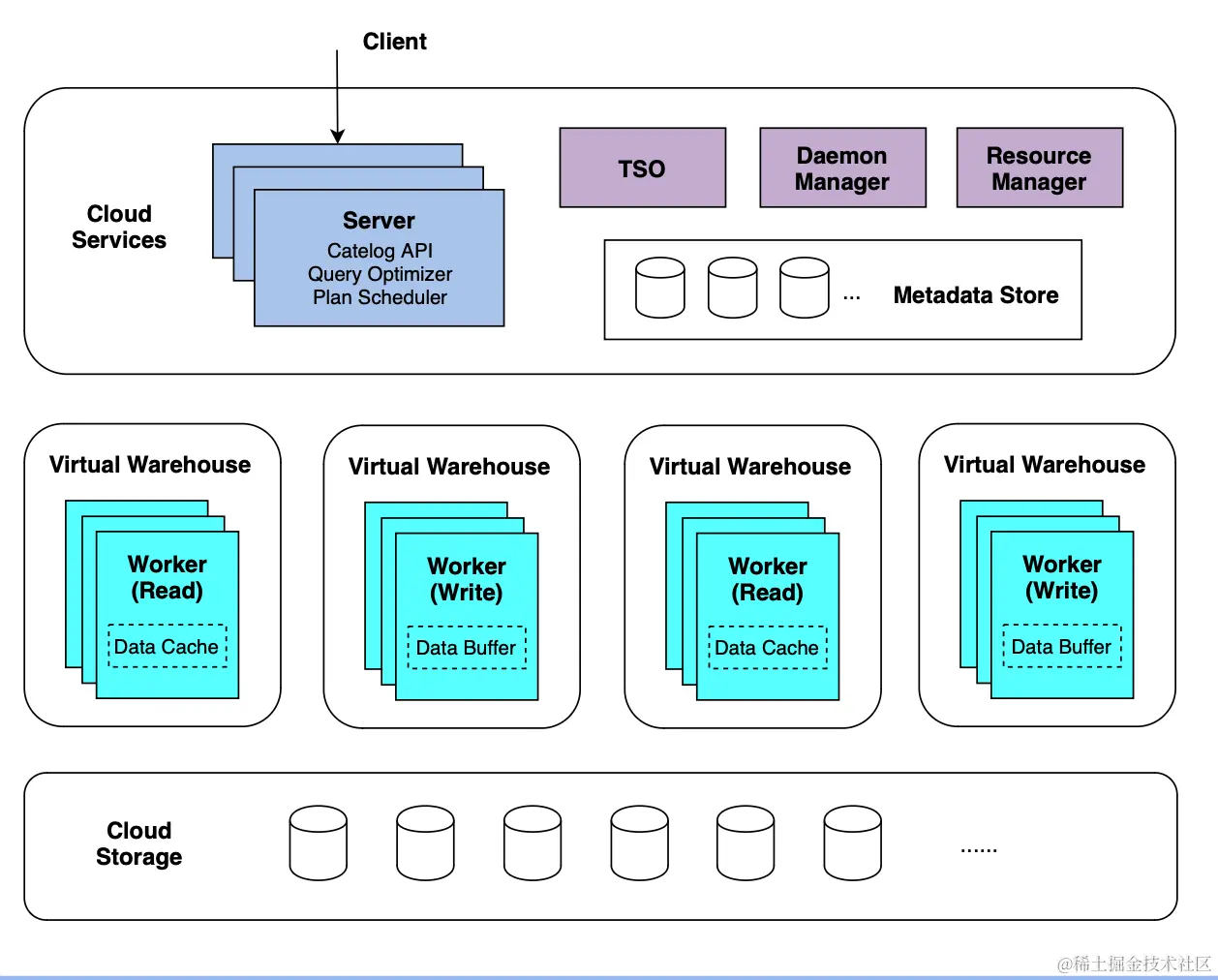 Resource Manager : 顾名思义用来管理资源。计算层的 Virtual Warehouse 以及 worker 都由 Resource Manager 管理,分配查询和数据写入应该由哪个 worker 执行;Resource Manager 同时做一定的服务发现,如有新的 worker 加入或新的 Virtual Warehouse 创建时,Resource Manager 能够发现。