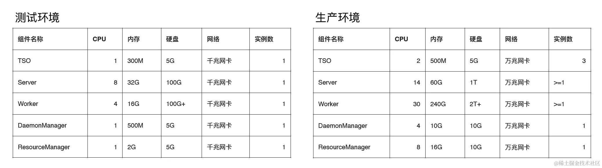 在部署 ByConity 时,不同的组件有不同的硬件要求。对一些共享服务,如 TSO、Daemon Manager 和 Resource Manager,其资源需求相对较低且比较固定;server 和 worker 所需资源相对较多,尤其是 worker,需要根据不同的查询场景部署到不同的硬件规格上。