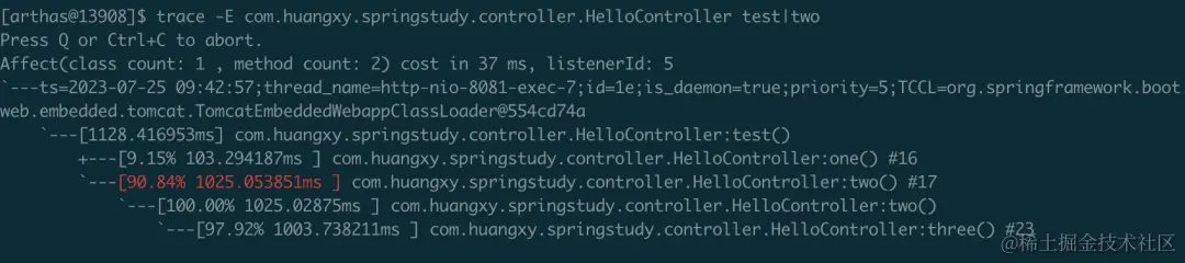 $ trace -E com.huangxy.springstudy.controller.HelloController test|two