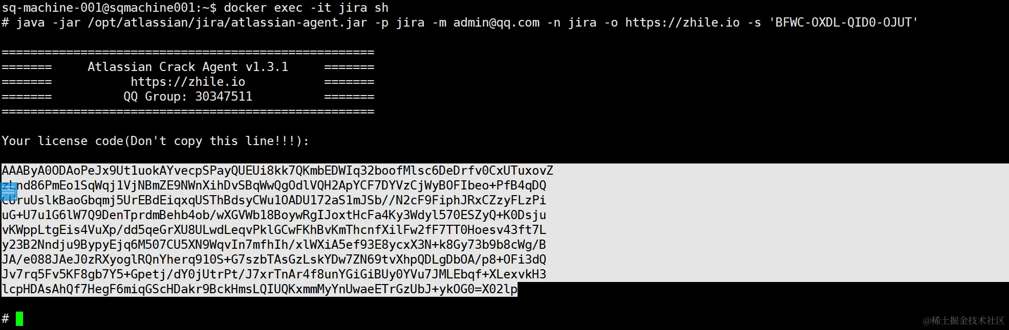 java -jar /opt/atlassian/jira/atlassian-agent.jar -p jira -m admin@qq.com -n jira -o https://zhile.io -s 'B62R-808W-X0UQ-M9B9'