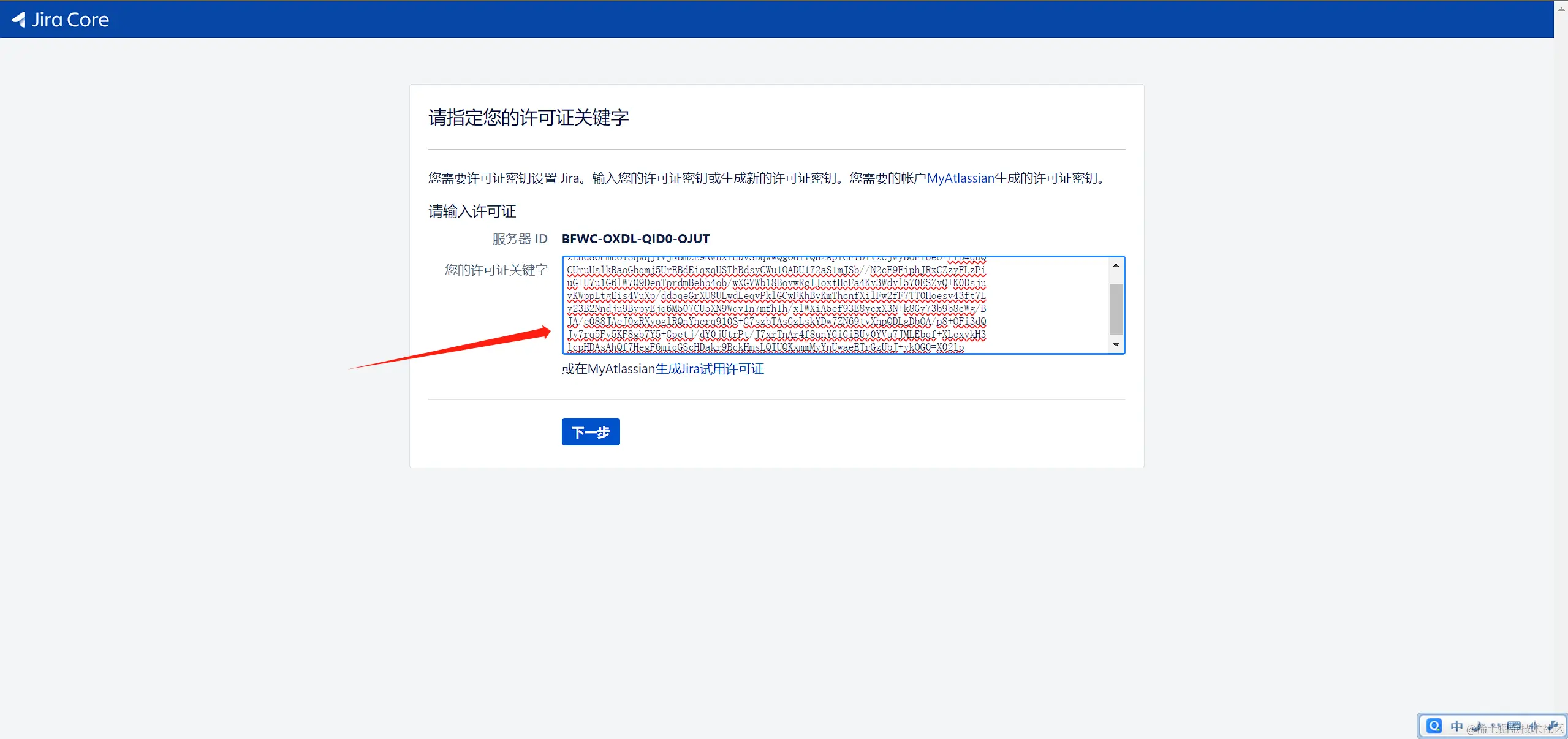3、将输出许可秘钥结果回填到 Your License Key 填写框中: