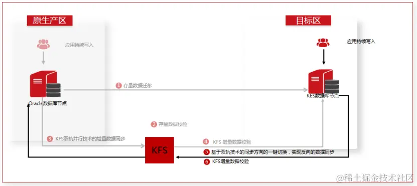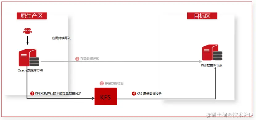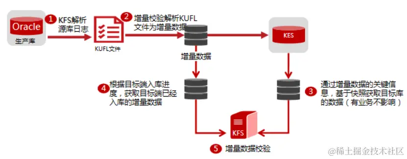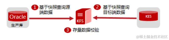 ② 应用切换到KES为业务主库后,在KFS实时同步增量数据到Oracle的基础上,并行运行增量校验确认KES->Oracle的数据一致性: