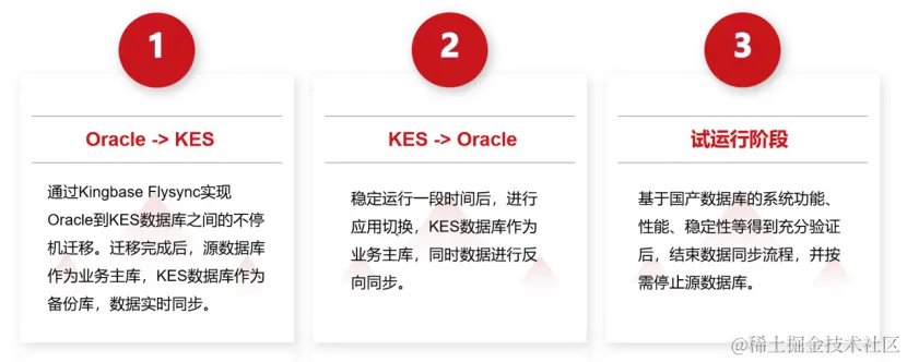 Kingbase FlySync实现Oracle到KES之间的数据实时同步,保证国外数据库与KES数据库之间的数据一致,随时应对所需的业务切换,即双轨并行。通常基于双轨并行方案的国产数据库替代过程可分为三个阶段: