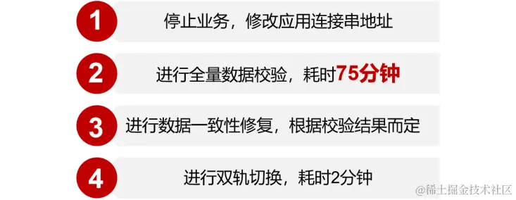 使用此方案后,从数据迁移到数据库切换的全过程,增量数据校验与数据实时同步同时开展,在数据库切换前即可在线完成数据一致性确认和修复,大幅缩短数据库切换的耗时。