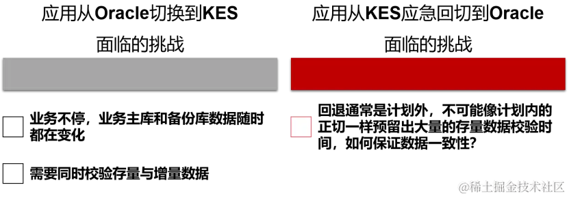 ③ 试运行过程中,可能会有应急演练、应用业务异常的情况,需要应急回切为Oracle为业务主库,切换完成后,采用增量校验保障Oracle->KES数据一致性: