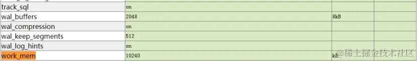 检查快照期间参数配置报告,果然,搜索到work_mem为10240 kB,这是KES的默认配置。对于普通的查询是足够的,但对于存在大量复杂Hash join或者排序的SQL就会有所不足。
