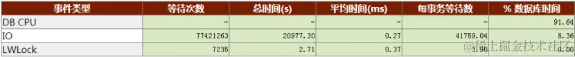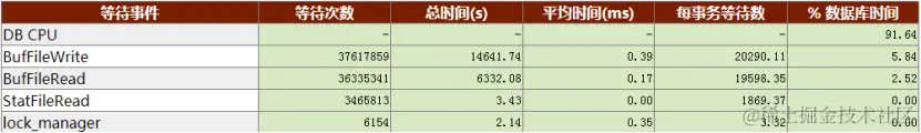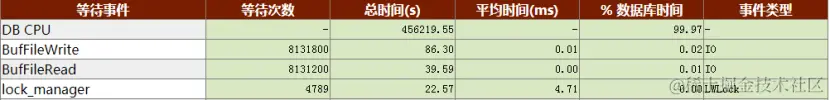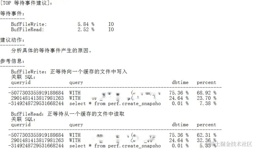 报告显示这8.36 %的IO等待事件,主要来自BufFileWrite(5.84 %)和BufFileRead(2.52%),其他等待事件可以忽略。