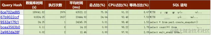 排在前两位的SQL分别占了76.36 %和24.64 %的数据时间,平均执行时间63.62秒和23.44秒,等待时间占比为8.67 %和7.52 %,应该就是BufFileRead和BufFileWrite两个等待事件。