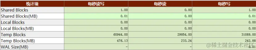 找到了!数据库中存在233.24 MB/s的读临时块,242.88 MB/s的写临时块。与负载分析报告里的IO读写一致,但是高于主机IO里的59 MB/s读写,这也是合理的,说明操作系统缓存了一部分KES发出的写盘请求。进一步分析,临时块不是临时表的读写,而是SQL语句在排序、Hash连接的时候使用的临时使用的磁盘空间。