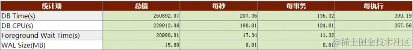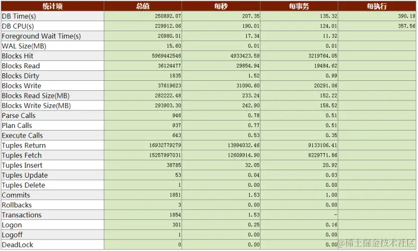负载分析报告里提供了大量经过提炼的指标,包括数据库时间、前台等待事件、实例IO、解析计划执行次数、事务、元组、死锁、登录登出等。其中每秒那列的统计值很直观。