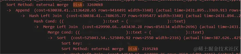 福尔摩斯.K从完整SQL列表报告里,很快找到了对应的SQL,生成的执行计划十分复杂,果然发现了里面存在不少Hash Join以及外部排序(external merge Disk),平均使用磁盘空间在32 MB左右,远远大于当前设置的10 MB。