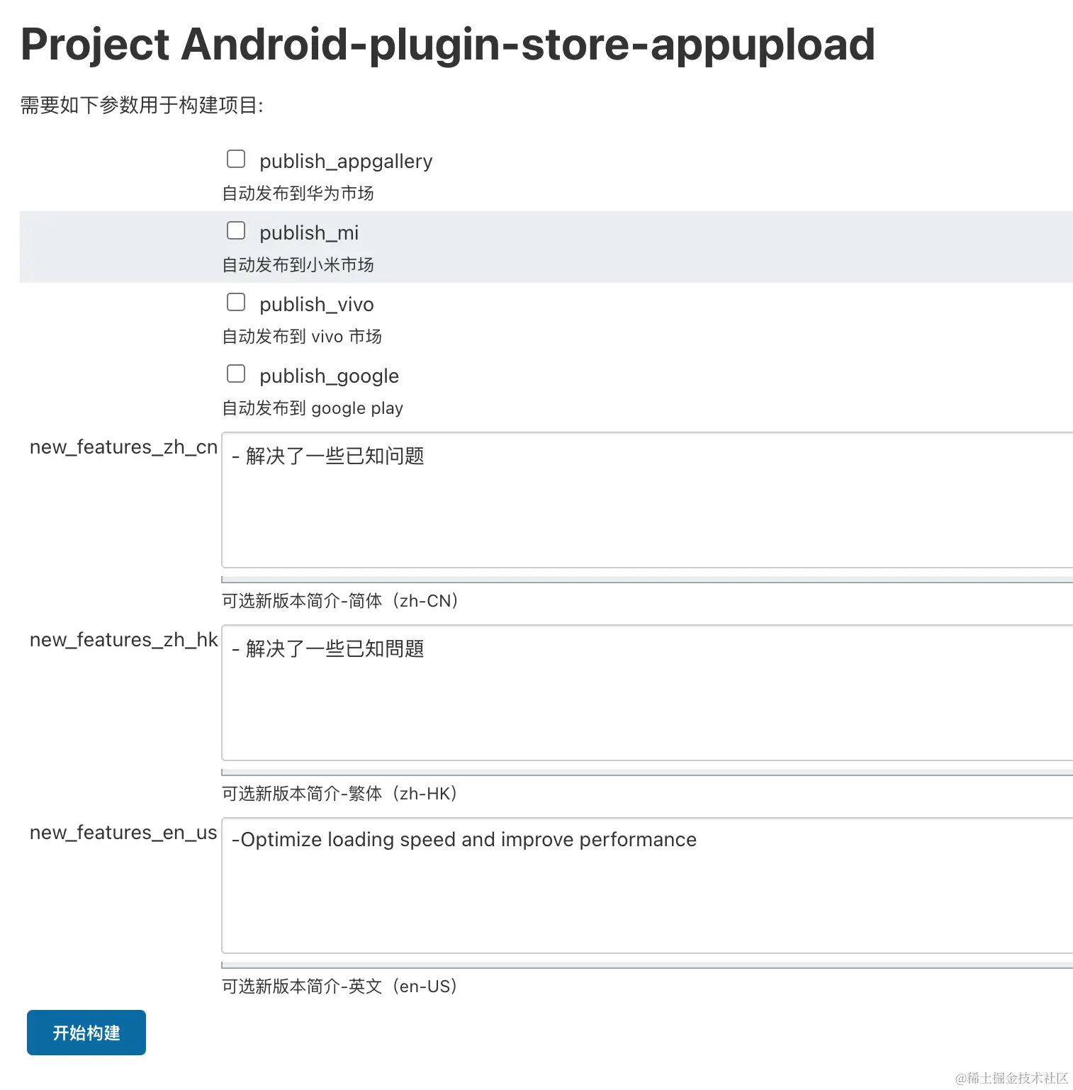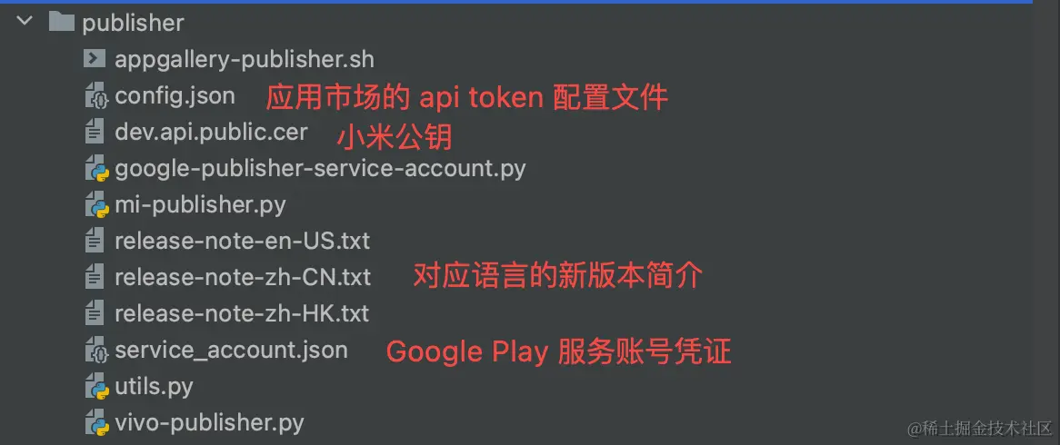 本工具的作用是实现一键包体自动上传及发布到应用市场,目前已接入 Google Play、小米、vivo、华为,接入本工具后就不再需要登录市场的后台手动上传,更加便捷和节省时间。 github.com/mikeFei1000…