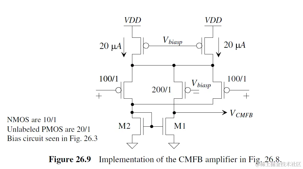 一种CMFB实现方法如下图所示. 当输出Output=Vbiasp, M1和M2流过电流为20uA