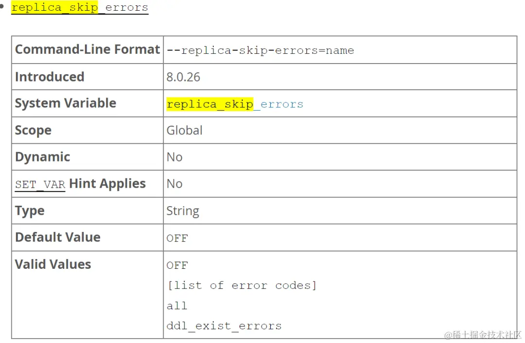 在你提供的示例中,replica_skip_errors的值设置为1032,10621。这意味着,如果从服务器在复制过程中遇到错误码1032或1062,它将跳过这些错误,并继续复制进程。
