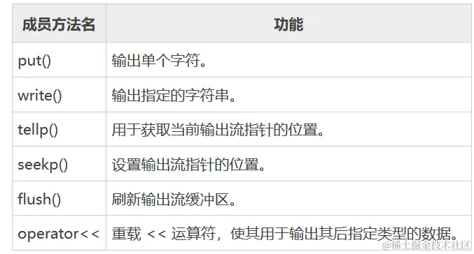注意,表 1 和表 2 中仅罗列了 istream 和 ostream 类中常用的一些成员方法,关于这些方法的具体用法,后续章节会做详细介绍。