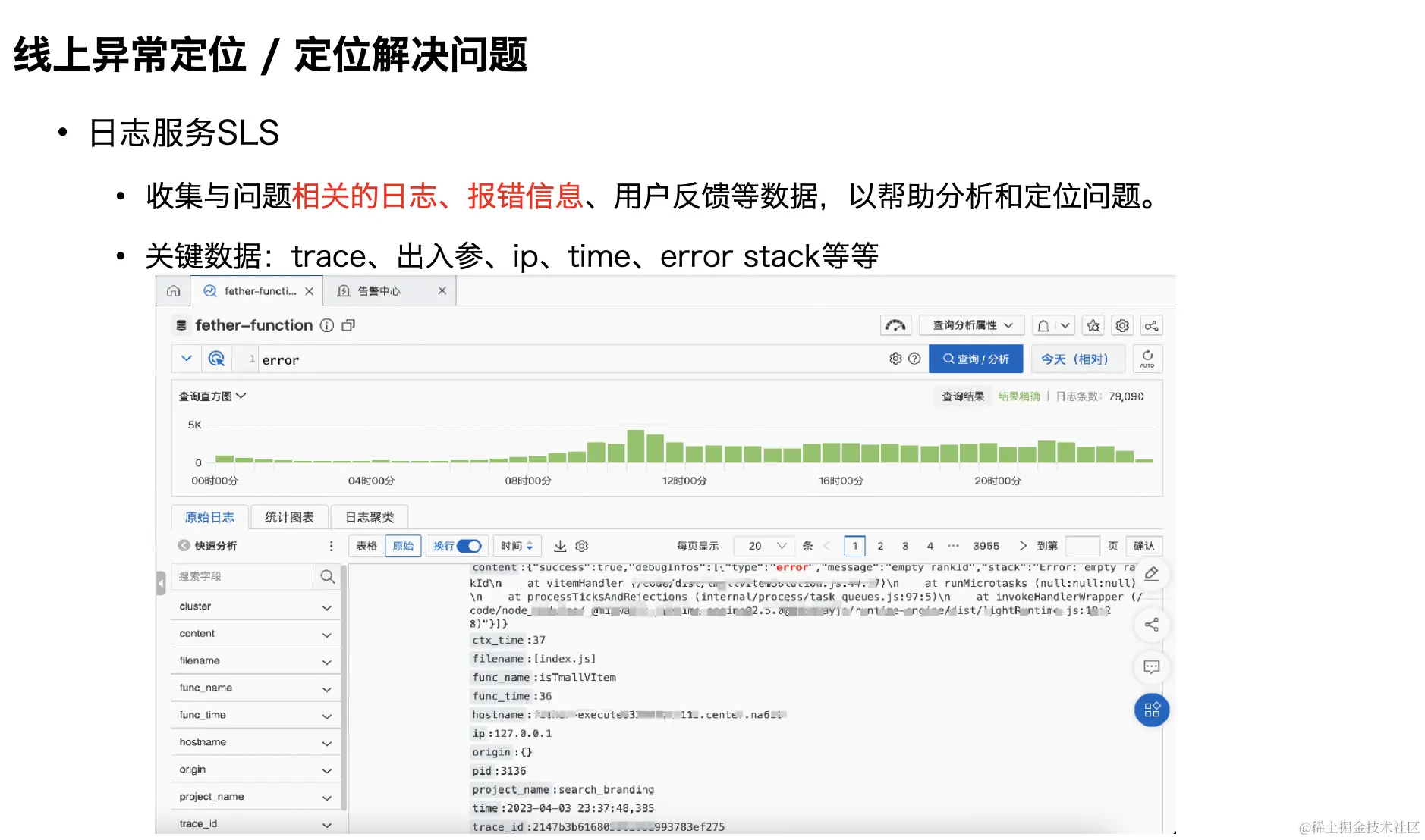 当然在日志定位过程中,日志服务是不可或缺的。需要收集相关的日志、错误信息、用户反馈等数据,以帮助解决和定位问题。关键数据如 trace、出入参、ip、time、error stack 等都可以记录在日志中,以便查找问题。例如,下图显示了具体的函数,host,PID 以及 trace,这些信息都呈现得非常清晰明了。此外在这个阶段还可以看到一些错误信息,以直方图的形式展现出来。