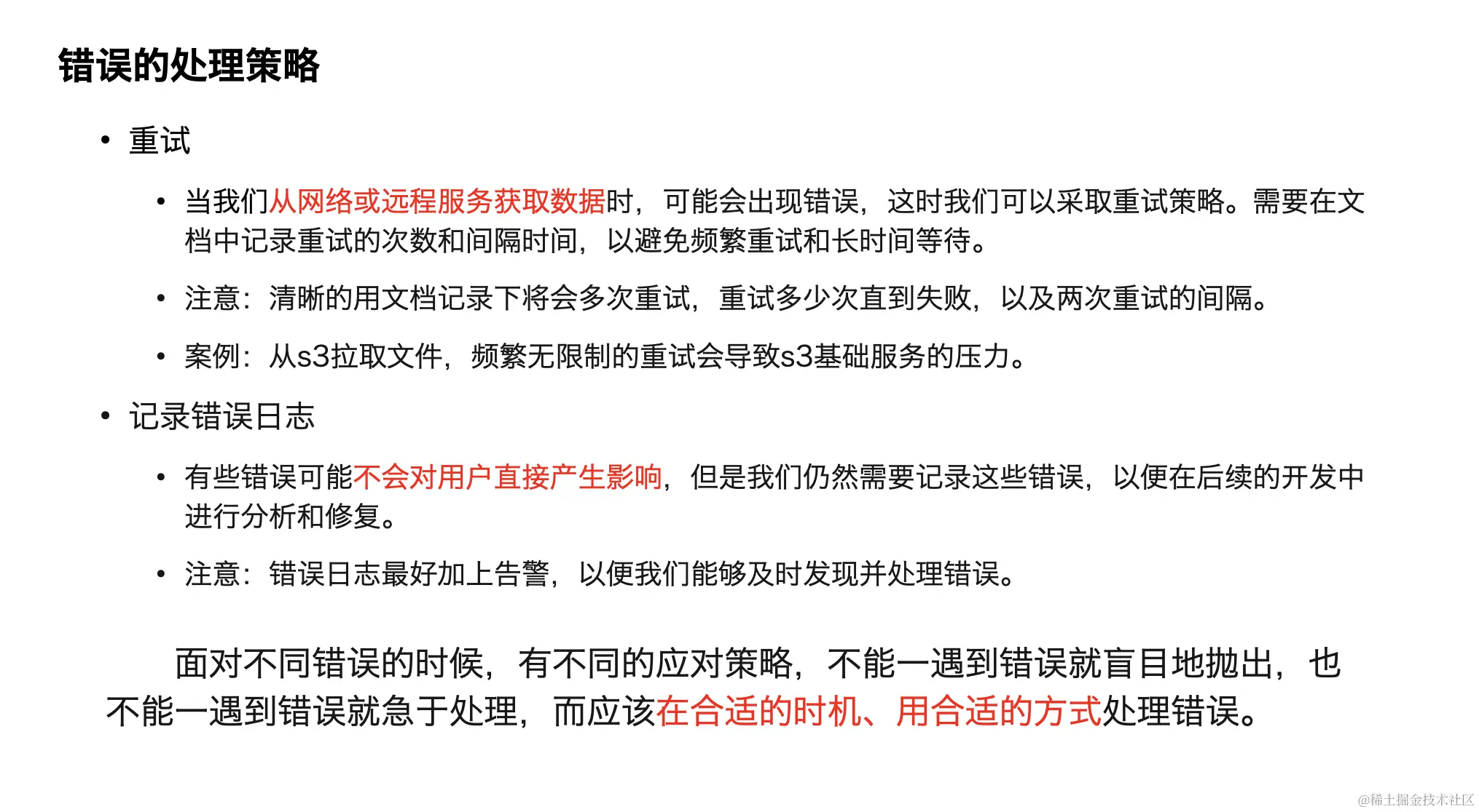 首先要讨论的是错误处理策略。因为错误通常在开发过程中非常常见,面对不同类型的错误,我们需要采取不同的处理方法。