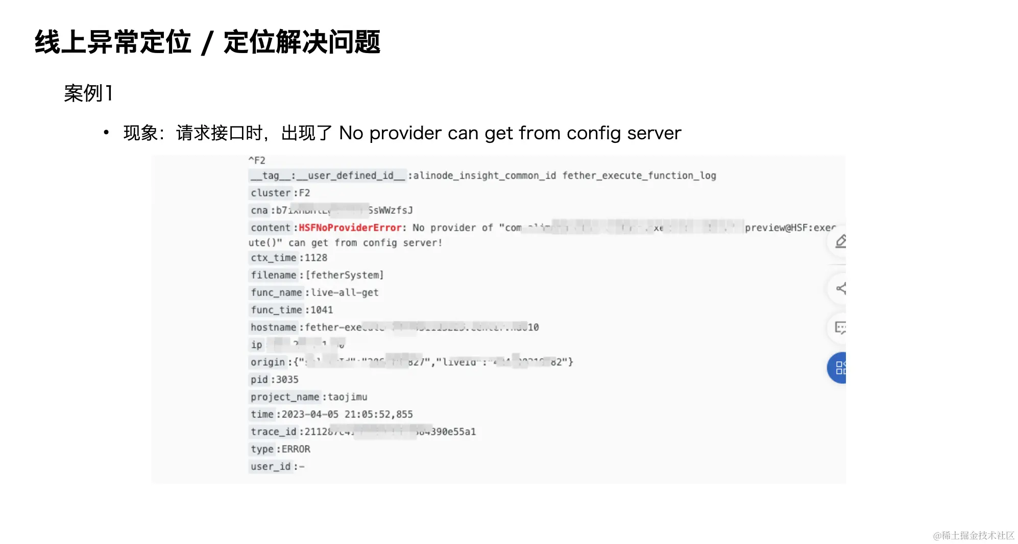这里有一个案例,我们之前遇到了一个问题,出现了以下错误:"No provider can get from config." 对于这个服务器错误,首先无法确定出现的原因。幸运的是,有日志记录和链路跟踪系统的支持。首先,使用链路跟踪系统来查看这个错误的起因。追踪了请求的路径,发现从服务A到B再到C时,出现了一个错误。这可以确定问题的一个可能原因,即当路由到指定主机时出现了错误。结合之前的日志信息,"No provider can get from config server" 意味着无法找到这个主机的提供者,或者说不应该路由到这个主机上。