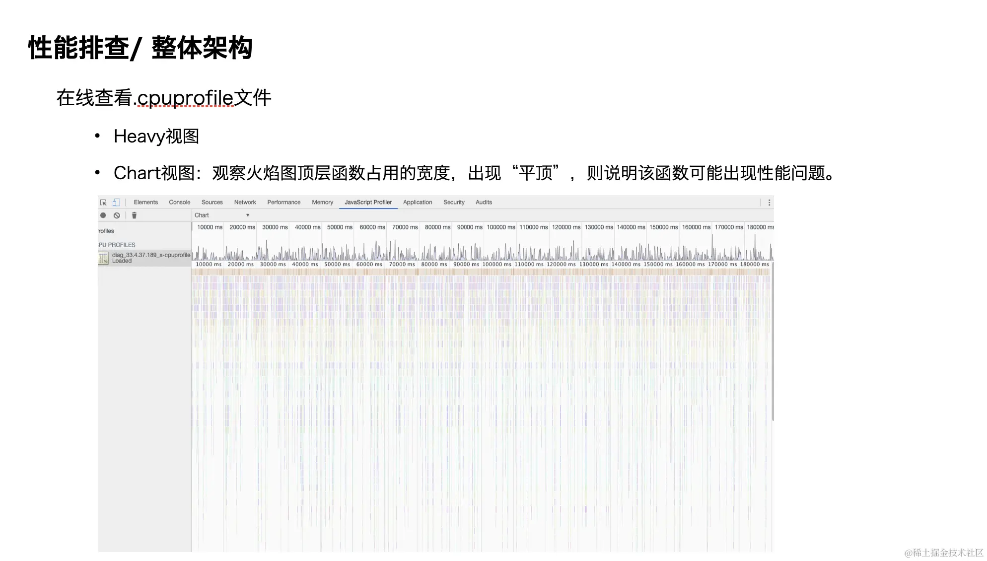 接下来我们通过平台,可以查看 CPU profile 文件,其中有两种视图:Heavy 视图和 Chart 视图。我在这里截取了一个"Chart"视图的示例,它展示了我们线上服务的整体情况。从图中可以看出,整体情况相对稳定,火焰图的顶层函数占用宽度也相对尖锐。在排查 CPU 问题时,我们需要观察火焰图顶层函数的宽度。如果发现瓶颈情况,很可能是函数性能存在问题。总体来说,情况看起来还可以。大家可以通过导出 CPU profile 的方式,然后使用Chrome 工具查看。
