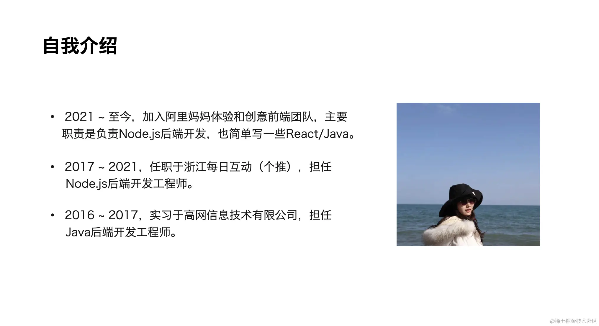 大家好,我是来自阿里妈妈的会理。今天给大家分享的主题是《我是如何在 Node.js 中定位异常的》。首先做一下自我介绍。我于 21 年加入阿里妈妈体验和创意前端团队,主要负责 Node.js 后端的开发。平时也简单写一些 react 或者是 Java 相关的内容。之前的四年时间里,在浙江每日互动担任 Node.js 后端开发工程师的职位。在学校期间实习于高网信息技术有限公司,担任 Java 后端开发职位。