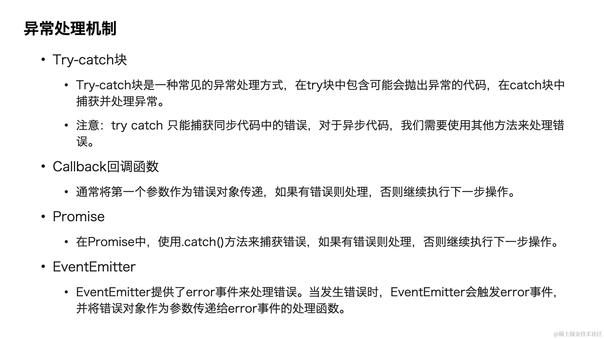 第二部分是 Node.js 中的异常处理机制。异常处理机制中最常见的是 Try-catch 块。在 try 块中,我们可能会包含可能引发异常的代码,然后在 catch 块中捕获和处理这些异常。但需要注意的是,try-catch 只能捕获同步代码中的错误。