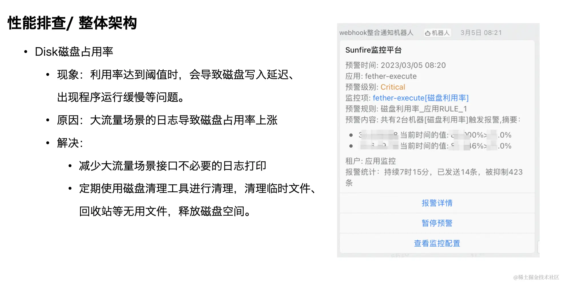 在发现问题后,我们迅速取消了不必要的日志记录,并增加了定时清理磁盘的工具,以释放磁盘空间。这样做有助于解决磁盘空间问题,因为高磁盘利用率会导致磁盘写入延迟和运行速度下降,这是一个相当严重的问题。