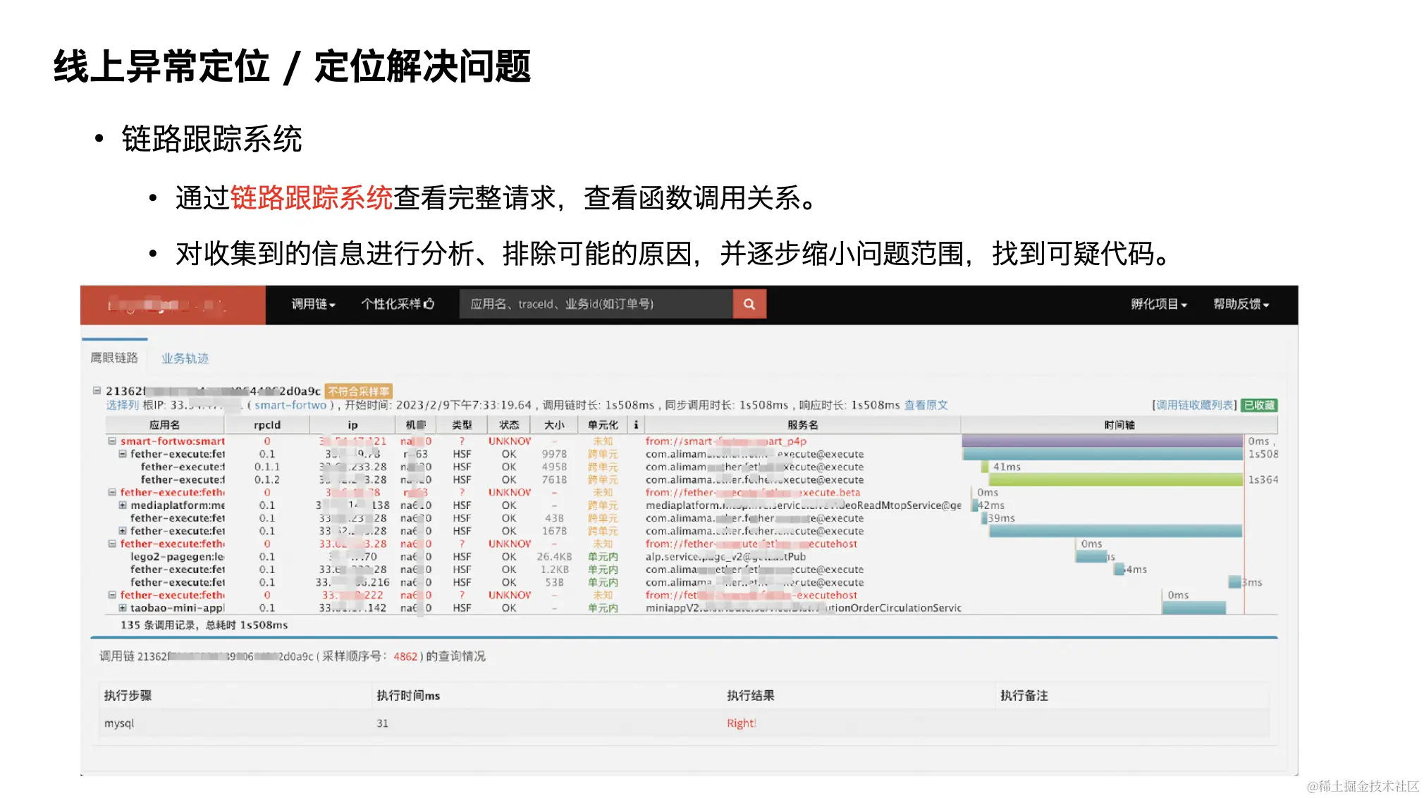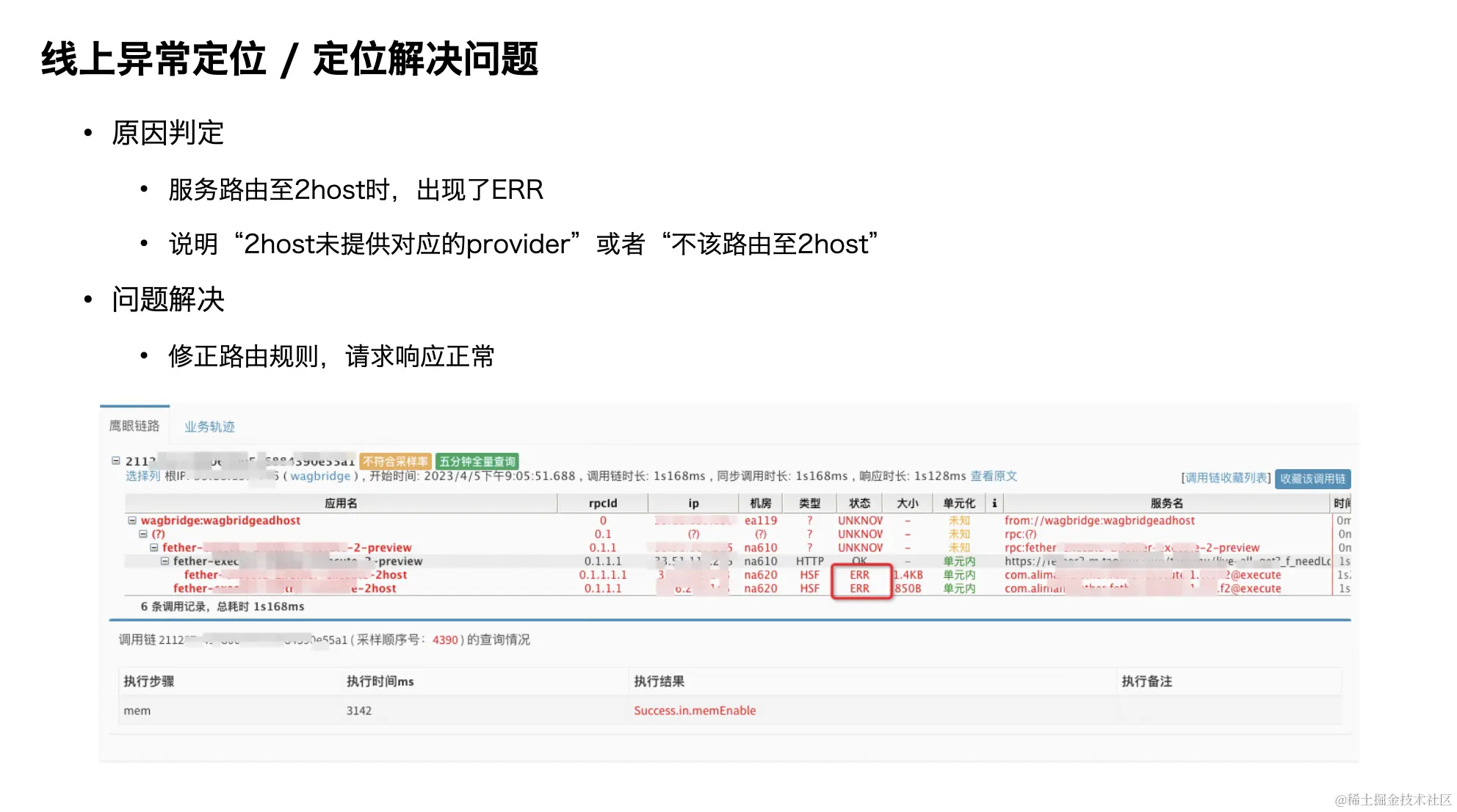 这可以分成两种情况,第一,路由是正确的,但主机没有提供相应的服务。第二,根本不应该路由到这个主机上,因为它不提供所需的服务。最终,确定了问题所在,需要修正路由规则,不再将请求路由到该主机,从而解决了问题。这是一个案例,通过链路跟踪系统帮助排查了问题,定位到了出现问题的服务,确定了是否应该路由到该服务,以及该服务是否应提供所需的功能。