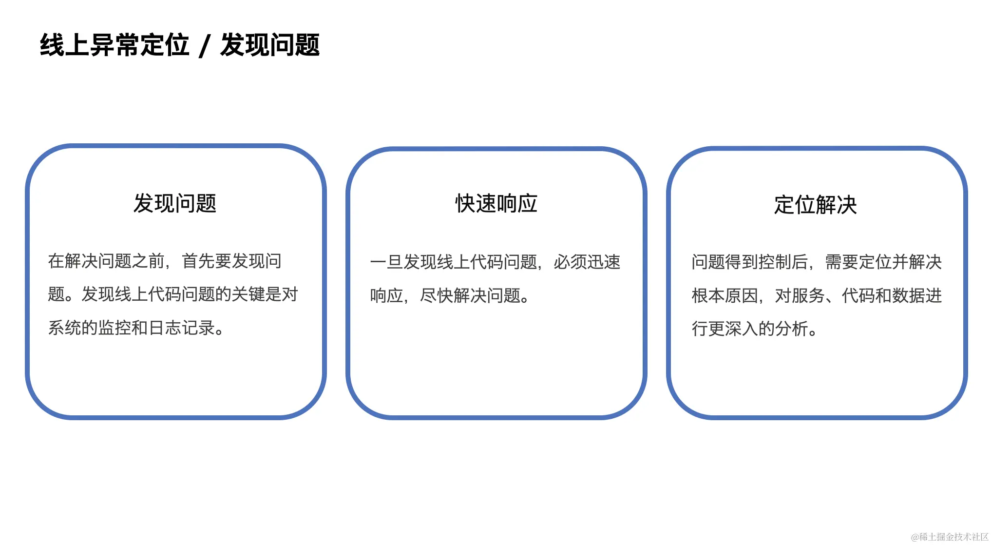 - 发现问题,最好能够在客户发现问题之前自己发现问题,这需要一些线上异常监控和日志记录。