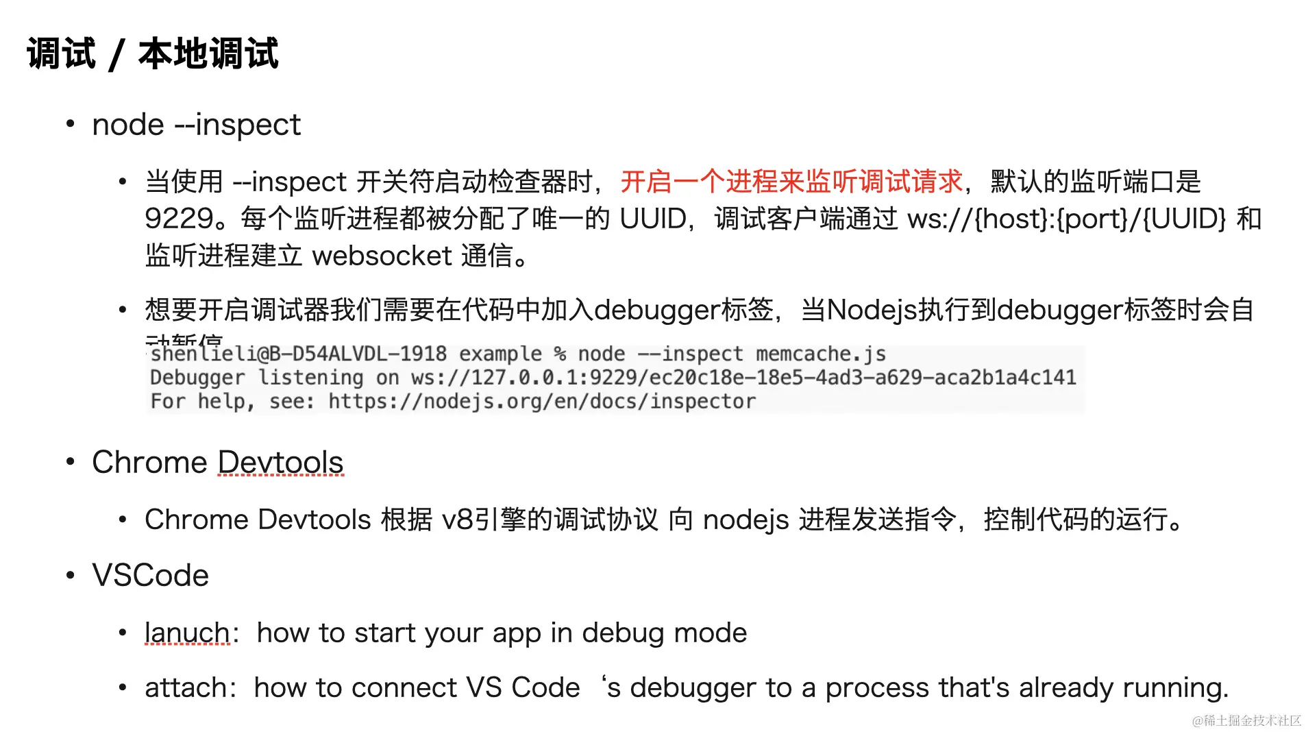 如果有感兴趣的同学可以试着了解一下,是怎么进行调试的。有些同学可能好奇,为什么这个 inspect 命令一启动,就可以通过 Vscode 或者 Chrome 来调试,它们之间的机制是什么?