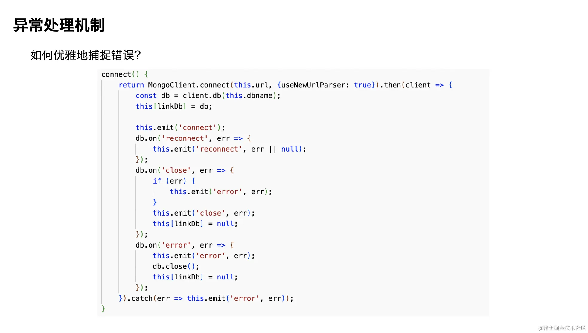 现在让我们来看一个更为优雅的处理错误的代码示例。首先我们可以观察到,在示例中的 connect 方法使用点(.)运算符来返回一个 Promise,而后使用 .catch 方法来捕获可能的错误。另外使用 .DB 方法则采用了 .on 方法,用于监听可能出现的错误事件,表明这是一个 EventEmitter。