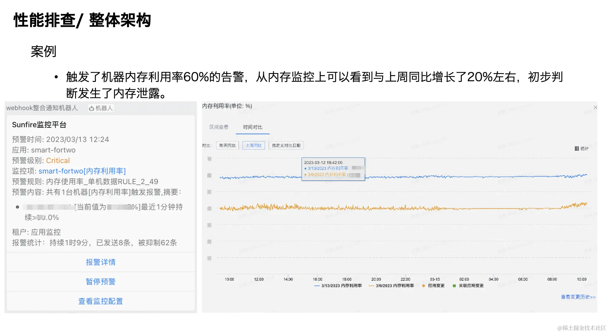 有一个案例,曾经我们遇到过一个内存利用率达到 60% 的警报,从内存监控数据中可以看到,与上周相比,内存增长了大约 20%。由于内存告警,我们迅速进行了排查。