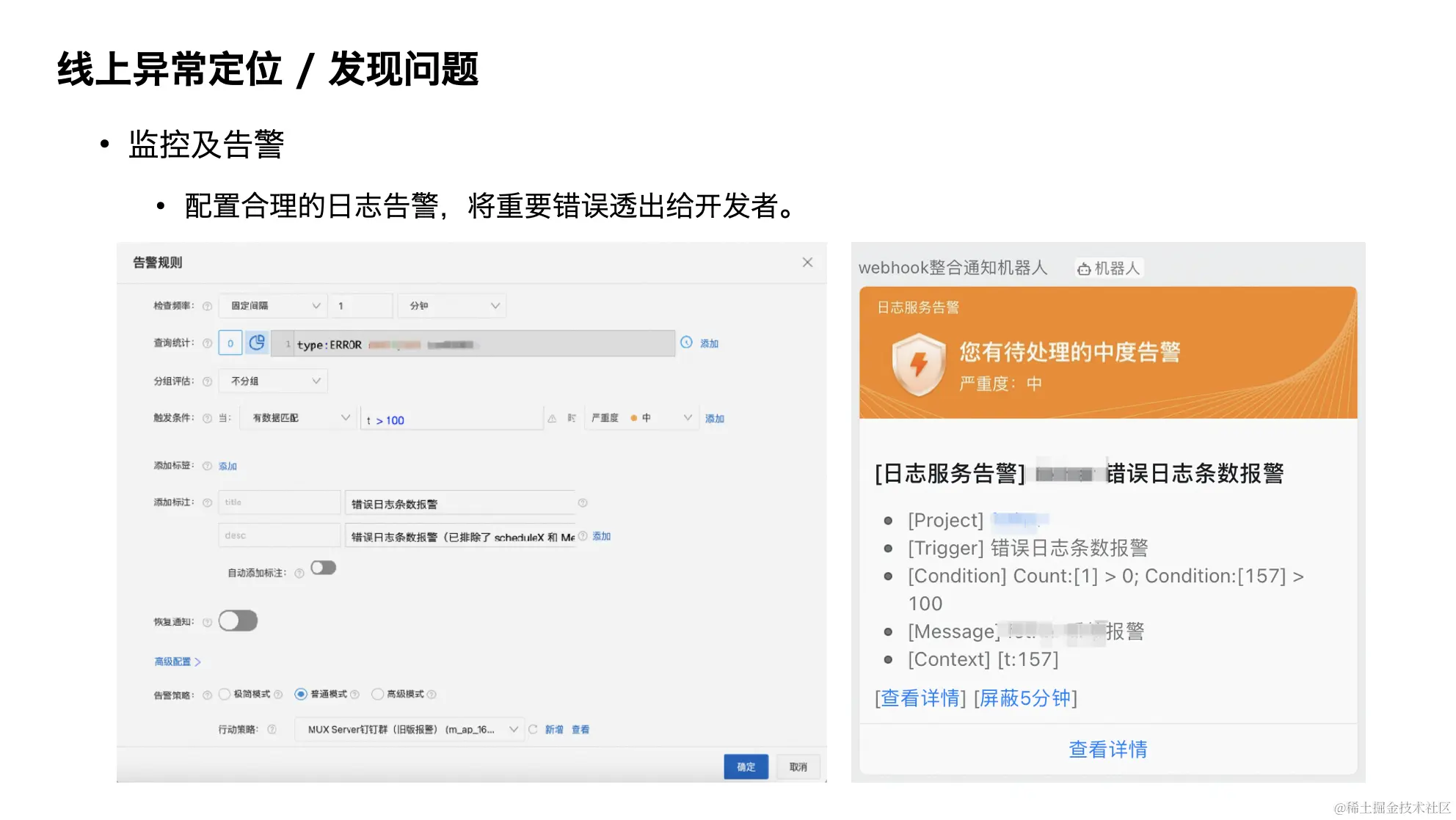 例如我们的告警机制是当错误日志数量超过 100 时,立即发送一条消息。通常一些异常是正常出现的,不需要每个错误都触发告警。但当真正严重的错误发生时,告警数量迅速上升,需要重点介入处理。这就是告警机制的好处。